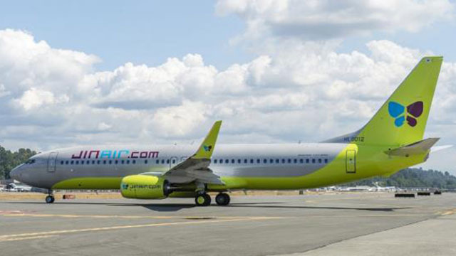 진에어 항공기 점검 중인 모습, 비상 인원이 대기하고 있습니다.